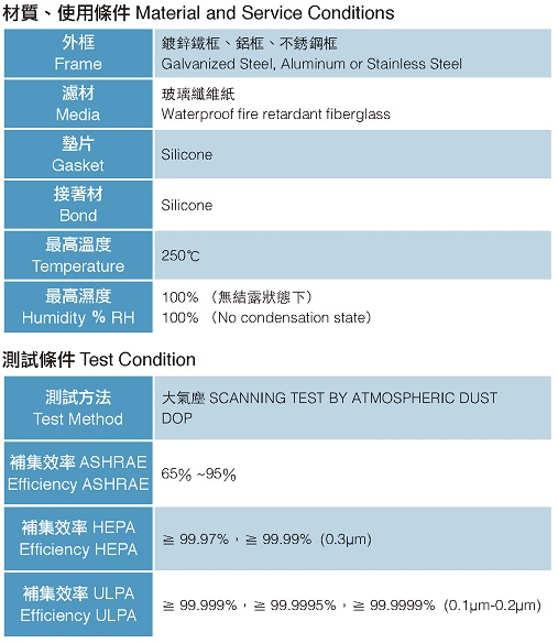高效及超高效濾網- 鋁隔板耐高溫型Separator High Temperature Filter高效及超高效濾網- 鋁隔板耐高溫型 產品概述:屬於高溫用過濾網,其效率在常時溫度250℃高溫狀態下長時間使用仍能維持0.3µm單分散DOP試驗99.97%以上的超高性能過濾網,其構造是由不繡鋼(SUS304)外框,強性玻璃纖維紙的濾材,特性可耐高溫接著的材質為耐高溫Silicone,墊片亦同材質,並以鋁材隔開濾紙及支持處完全密合接著. 用途在於特殊場所使用。如膠業、醫藥品等清淨度極高的熱風乾燥場所及放射性廢棄物燒卻爐最終的排氣口及半導體。 |